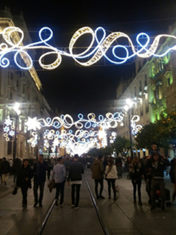 El centro de Sevilla ofrece aspecto navideño. La nueva iluminación de la avenida de La Constitución anima a los viandantes que llenan el centro de Sevilla viendo escaparates y realizando compras.