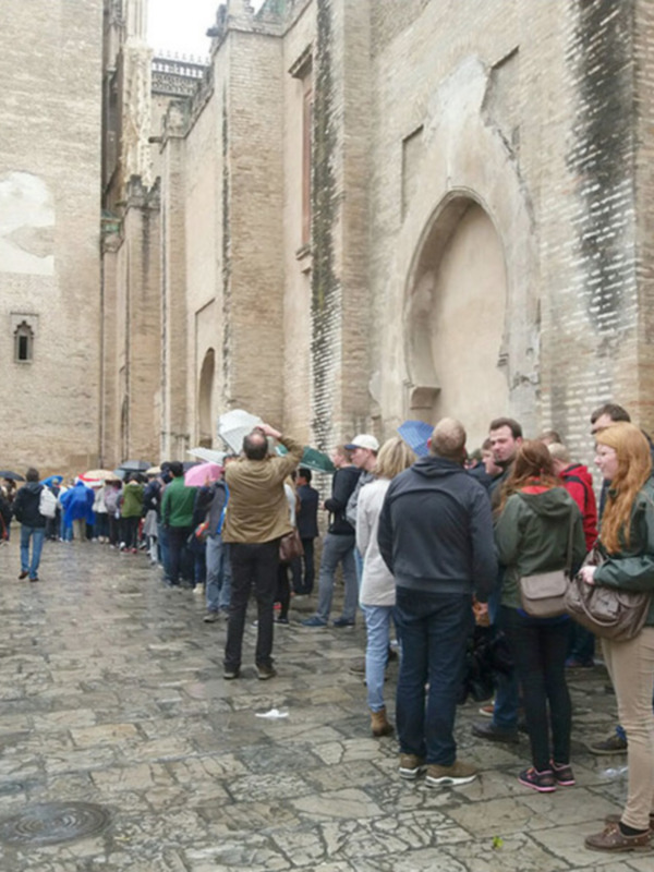 Colas bajo la lluvia para acceder a los principales monumentos de Sevilla
