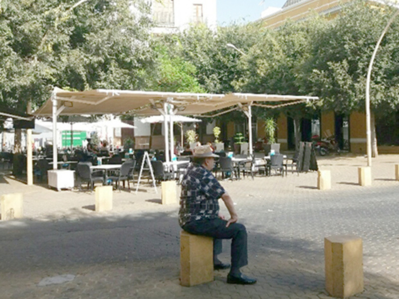 A diario las calles de Sevilla nos dejan imágenes curiosas. En esta imagen un turista sentado en un bolardo contempla la Alameda. La Alameda de Hércules y su entorno se ha convertido en las Ramblas de Sevilla, un lugar de encuentro y ocio basado en la gastronomía. Muy atractivo para los turistas.