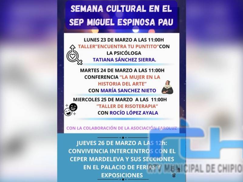 La Sección de Educación Permanente de Adultos ‘Miguel Espinosa Pau’ de Chipiona ha hecho público el programa de su semana cultural, que este año se desarrollará del lunes 23 al jueves 26 de marzo.