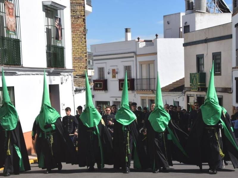 La Hermandad conserva asimismo formas tradicionales de portar sus pasos, siendo estos llevados al hombro por hermanos nazarenos sin antifaz, ceñidos con cincho de esparto y revestidos con peto de terciopelo verde bordado en oro. Este singular modo de procesionar, transmitido de generación en generación, refuerza la identidad propia de la corporación.