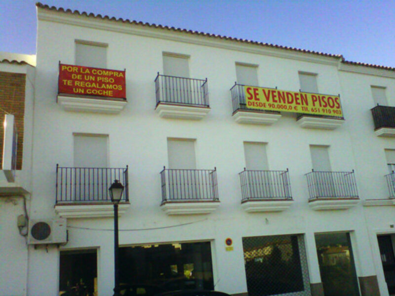 La disminución de la venta de pisos en los últimos años hace que el ingenio se agudice para conseguir el objetivo que no es otro que vender pisos. La foto está tomada en Arcos de la Frontera en Cádiz. Una empresa inmobiliaria está dispuesta a vender pisos y regalar un coche a los que compren. La disminución de la venta de pisos en los últimos años hace que el ingenio se agudice para conseguir el objetivo que no es otro que vender pisos. Los empresarios deben salir de los esquemas tradicionales de venta y recurrir a nuevas ideas que motiven al comprador.