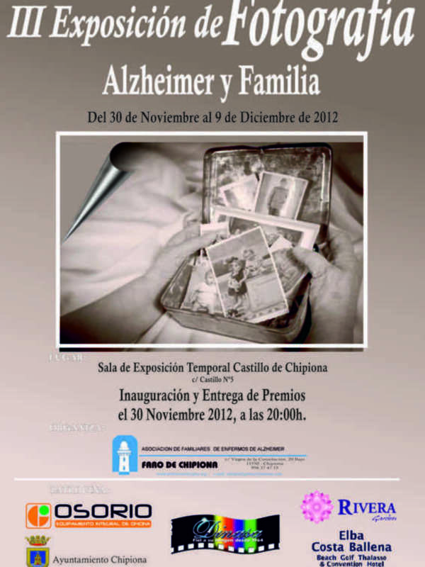 Desde la Asociación de Familiares de Enfermos de Alzheimer "Faro de Chipiona", solicitamos a su medio que nos publicite el cartel de la Exposición de Fotografía "Alzheimer y Familia"i cuya nauguracion tendrá lugar el proximo día 30 de noviembre de 2.012 (viernes) en el Castillo de Chipiona. En dicha exposicion se expondran las fotografías participantes en el III Concurso de Fotografía organizado por nuestra AFA "Faro de Chipiona", siendo la entrega de premio de este concurso tambien para ese día 30 de noviembre de 2.012.