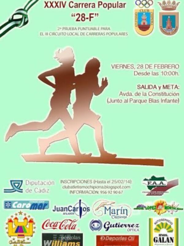 Chipiona, 31 de enero de 2014.- El próximo 28 de febrero tendrá lugar la histórica carrera popular 28 F Día de Andalucía, la decana de las pruebas locales, que organiza el Club Atletismo Chipiona con la colaboración municipal y llega este año a su edición número treinta y cuatro.