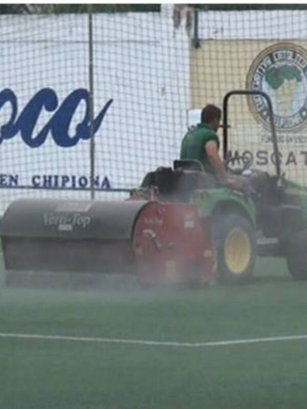 Radio-Televisión Municipal de Chipiona, 14 de septiembre de 2015 El césped artificial del Estadio Gutiérrez Amérigo recibió hoy lunes, 14 de septiembre, el tercer mantenimiento integral del año que deben realizarse para que permanezca en buen estado. La actuación que se ha realizado hoy consiste en la descompactación del material de relleno y lastre, más un cepillado profundo de toda la fibra. Este mantenimiento ha sido realizado por la empresa especializada del sector, Mantenturf, seleccionada mediante proceso de contratación pública, que incluye tres mantenimientos al año. Además del mantenimiento integral las actuaciones incluyen reparaciones intrínsecas como despegue de puntos de penalties, líneas y juntas. No incluido en el contrato de mantenimiento, se llevará a cabo también la sustitución de un zona completa de seis metros cuadrados que se encuentra muy deteriorada. La delegación de Deportes estima que esta actuación es fundamental, que consigue el doble objetivo de velar por la conservación del césped artificial en las mejores condiciones y preservar las cualidades biomecánicas del mismo para el beneficio de los usuarios.