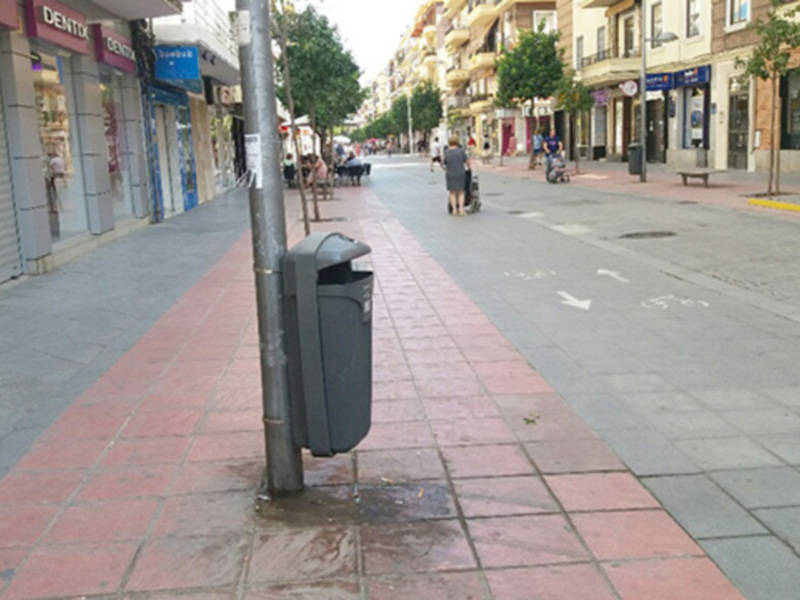 Numerosas papeleras que no tienen en su interior bolsa de plástico, provocan manchas anti higiénicas en los acerados; en las papeleras de depositan restos de alimentos, helados, envases varios, excrementos caninos, etc que al no estar en una bolsa de plástico, provoca que escurran sobre los acerados