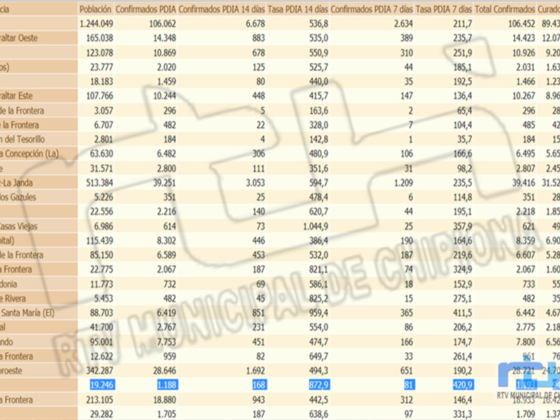 Los datos oficiales de la Consejería de Salud y Familias de la Junta de Andalucía sobre la marcha de la pandemia en Chipiona muestran que se mantiene la misma tasa de incidencia acumulada de ayer, 872,9. La cara negativa es que en las últimas 24 horas se han confirmado 17 positivos más.