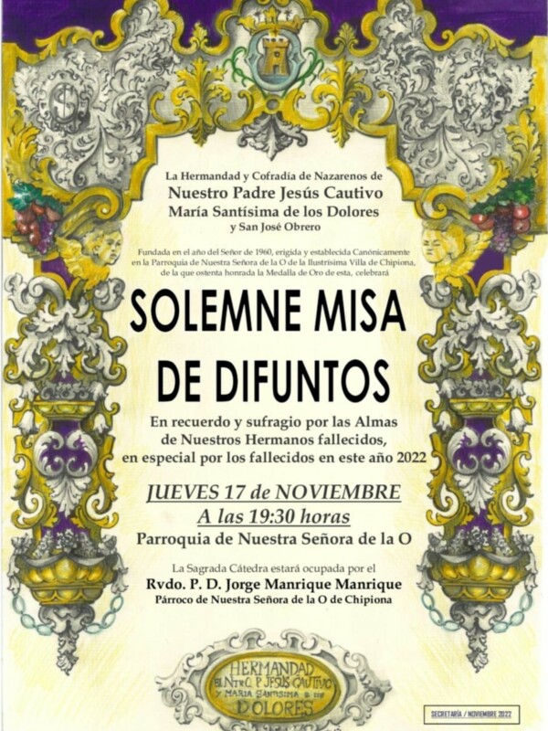 Por medio del presente correo electrónico, le comunico que la Hermandad del Cautivo de Chipiona celebrará Solemne Misa por el eterno descanso de nuestros Hermanos Difuntos, especialmente los fallecidos durante este último año. Adjuntamos convocatoria a este Culto de Reglas.