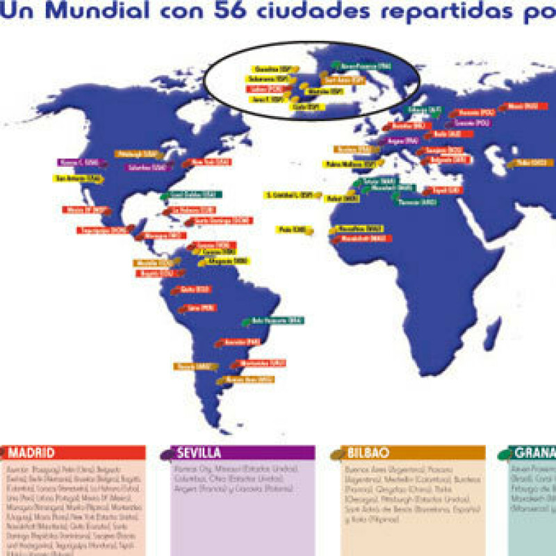 El Mundial de 2014 lo jugarían nada menos que 56 ciudades, repartidas por cuatro continentes, si finalmente la FIBA concede a España su organización este próximo mes de mayo en Ginebra. Es el número de ciudades hermanadas con las cinco sedes confirmadas oficialmente.