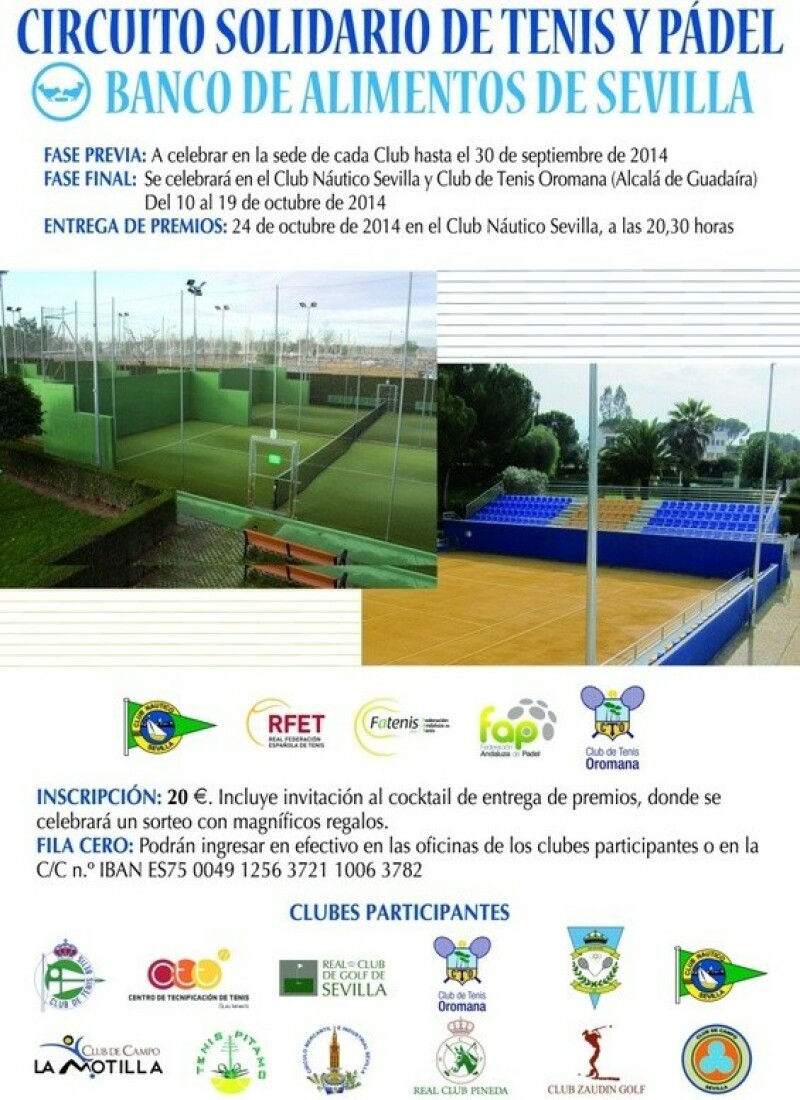 El IV Circuito solidario de tenis y pádel Banco de Alimentos de Sevilla ha iniciado su última recta final con el comienzo, entre las instalaciones del Club Náutico Sevilla y el alcalareño Club de Tenis Oromana, de la fase final. Tras la disputa de las rondas previas, desde la pasada primavera, en los distintos clubes locales adheridos a esta altruista causa, esta semana han comenzado a disputarse los encuentros con vistas a conocer los vencedores finales de un circuito cuyo cierre está programado para el próximo 24 de octubre en el Náutico, sede de la gala de clausura y entrega de trofeos.