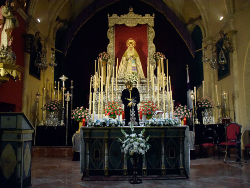 Le mostramos el altar de los cultos de triduo de la venerada Virgen de la Esperanza de la Hermandad de los pescadores de ribera de Jesús el Nazareno del barrio del Arenal de Alcalá del Río, que estuvo en la Sagrada Cátedra el Rvdo. Ambrosio de la comunidad de Religiosos Camilos.