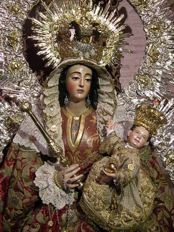 En la Parroquia de San Isidoro en días pasados acogió el besamanos a Nuestra Señora de la Salud, “Reina de la Costanilla” del barrio del mismo nombre de Sevilla, ocupando su capilla situada en la nave de la Epístola de dicha parroquia. Que vistió en esta ocasión el manto conocido como de las estrellas por el diseño de sus bordados, que están realizado en oro sobre terciopelo rojo en el siglo XVIII.