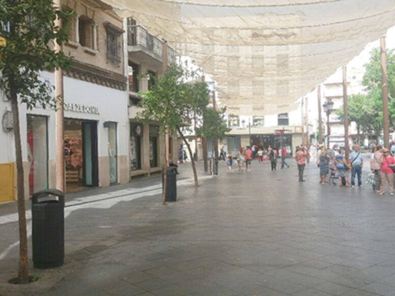 En los veranos calurosos del sur de Europa es frecuente ver terrazas y veladores que ocupan los acerados con visitantes que se toman un descanso a la sombra para seguir la visita turística. Lo que no es frecuente es encontrar espacios con arbolado, con sombras textiles, equipados con papeleras y sin gente. Podría ser que que no hay nadie porque no hay bancos para sentarse ?. Solamente hay las dos colas de las paradas de las líneas de bus 27 y 32. Foto: La Campana, Sevilla.