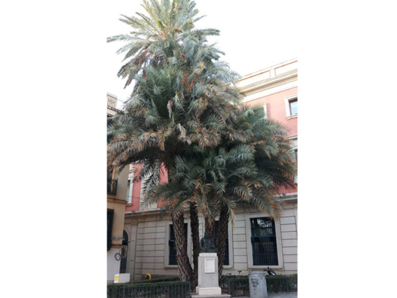Posiblemente este grupo de palmeras datileras sea uno de los mejores de la ciudad de Sevilla por su belleza y tamaño. Está ubicado en la calle Entre Cárceles, detrás del monumento a Cervantes. Este grupo ejemplar presenta un nivel de afectación de hojas quemadas en las puntas que producen decoloraciones en las hojas con riesgo de que se puedan secar. A qué es debido?. Pueden ser múltiples causas que tendrán que analizar los técnicos.
