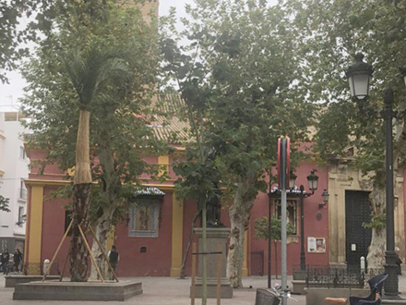 Los vecinos de San Lorenzo reciben con gran júbilo la plantación de palmeras en la plaza, recuperando así su fisonomía de tantos años. Es una palmera datilera de porte bajo.