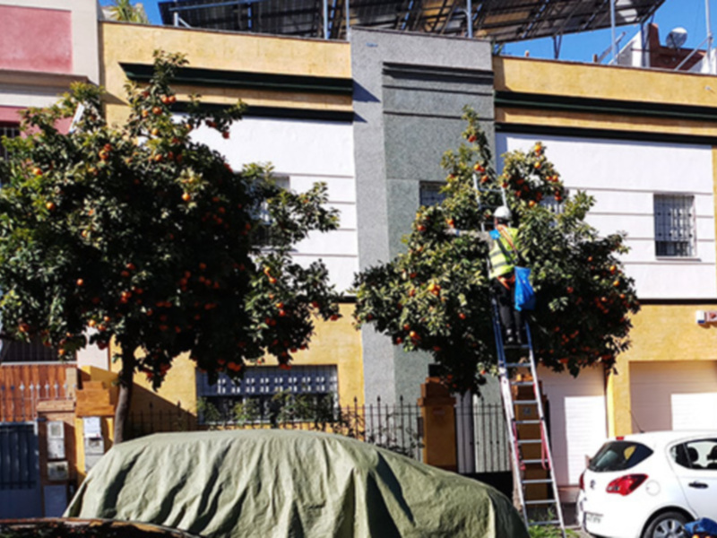 La plantación de frutales en la vía pública tiene ventajas e inconvenientes. La aparición de la fruta en el árbol, da un carácter rural y festivo, temporal y da colorido al paisaje urbano. La naranja amarga dependiendo de la climatología puede empezar su aparición en el arbolado durante el mes de agosto y durar hasta enero o febrero, hasta que se recoge la totalidad. Normalmente se recogen las naranjas caídas al suelo y en alcorques. Se debe evitar que las pisen los peatones, porque pueden producir resbalones si se pisan y accidentes. Igualmente si pasan los coches por encima, aplastando las naranjas. Normalmente se organiza la limpieza y recogida, de tal manera que las naranjas que caen en el alcorque, las recogen los jardineros que mantienen el arbolado. Las naranjas que caen en el acerado y vial, las recoge el personal de limpieza, normalmente.
