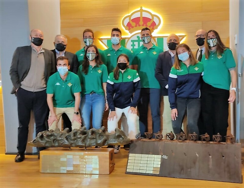Una delegación de los remeros y remeras verdiblancos que lograban la victoria en la última edición de la clásica del remo hispalense acude al Benito Villamarín para ofrecer oficialmente a la entidad sus respectivos trofeos.