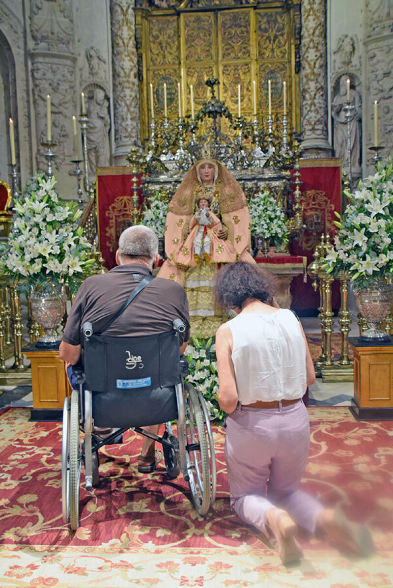 La patrona se presenta colocada sobre una peana y levemente retrasada de su posición habitual, evitando así, en medida de lo posible, que los fieles caigan en la tentación de aproximarse a besar las manos. Este gesto ha sido sustituido desde la llegada de la pandemia por una inclinación de cabeza o una genuflexión. El altar se encuentra exornado con alstroemerias, azucenas y hojas de eucalipto, en jarras repartidas por toda la Capilla Real.