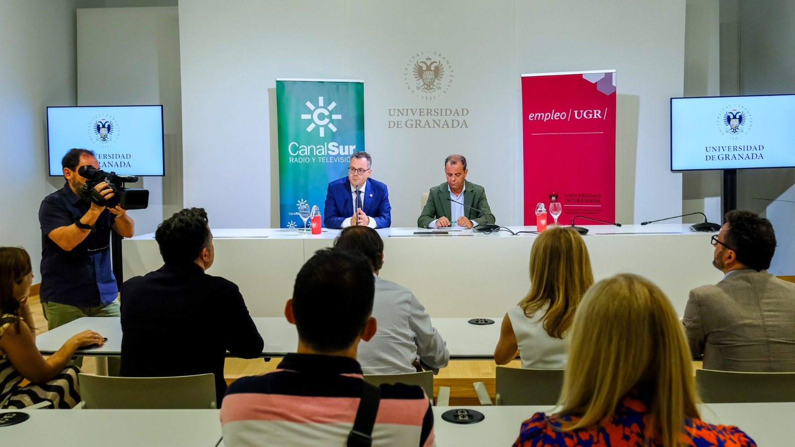 El acto, que se ha celebrado en la Sala de Prensa del Hospital Real de Granada, ha contado con la presencia del director general de RTVA, Juande Mellado, y el vicerrector Innovación Social, Empleabilidad y Emprendimiento de la Universidad Granada, Esteban Romero Frías, firmantes del convenio.