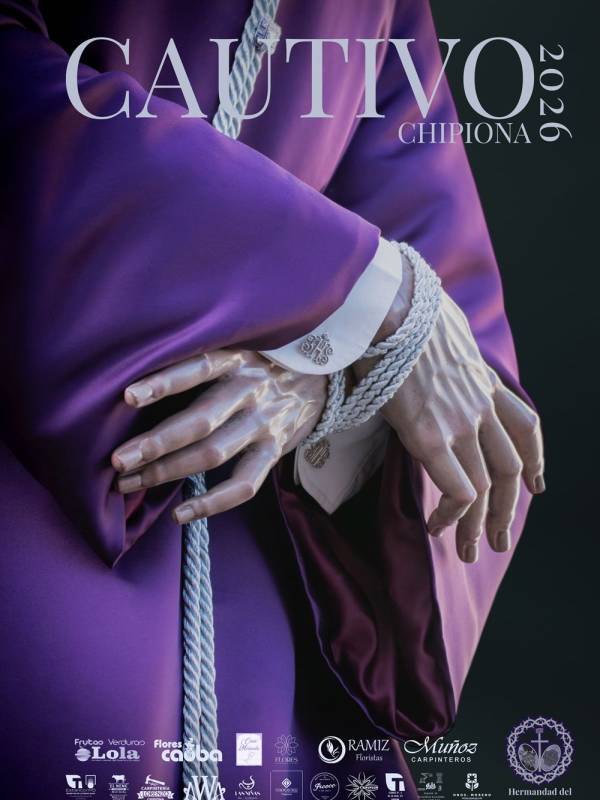 Descripción Artística: El cartel presenta una imagen íntima y de gran impacto visual. Destaca la textura de la túnica morada y, sobre todo, la expresión de humildad y entrega en las manos entrelazadas, que se encuentran atadas por una soga trenzada. El cartel incluye detalles de gran carga simbólica, como los gemelos en los puños de la camisa. El diseño tipográfico es elegante y limpio, centrando la atención en la imagen. La parte superior incluye el texto "CAUTIVO 2026" y, a continuación, "CHIPIONA".